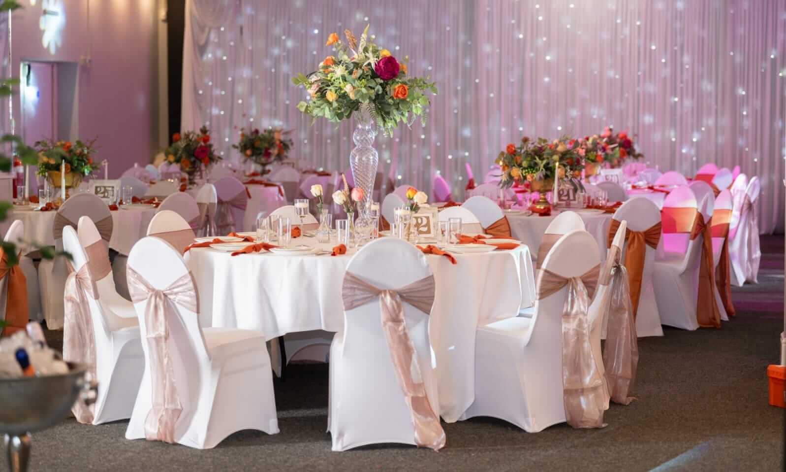 Chair styling gives the room a more refined finish by adding structure and softness in the right places. A chair cover provides a clean foundation, while sashes and drapes introduce movement, texture and colour. These details can echo your table décor, florals and signage, helping the entire theme feel connected from one area to the next.