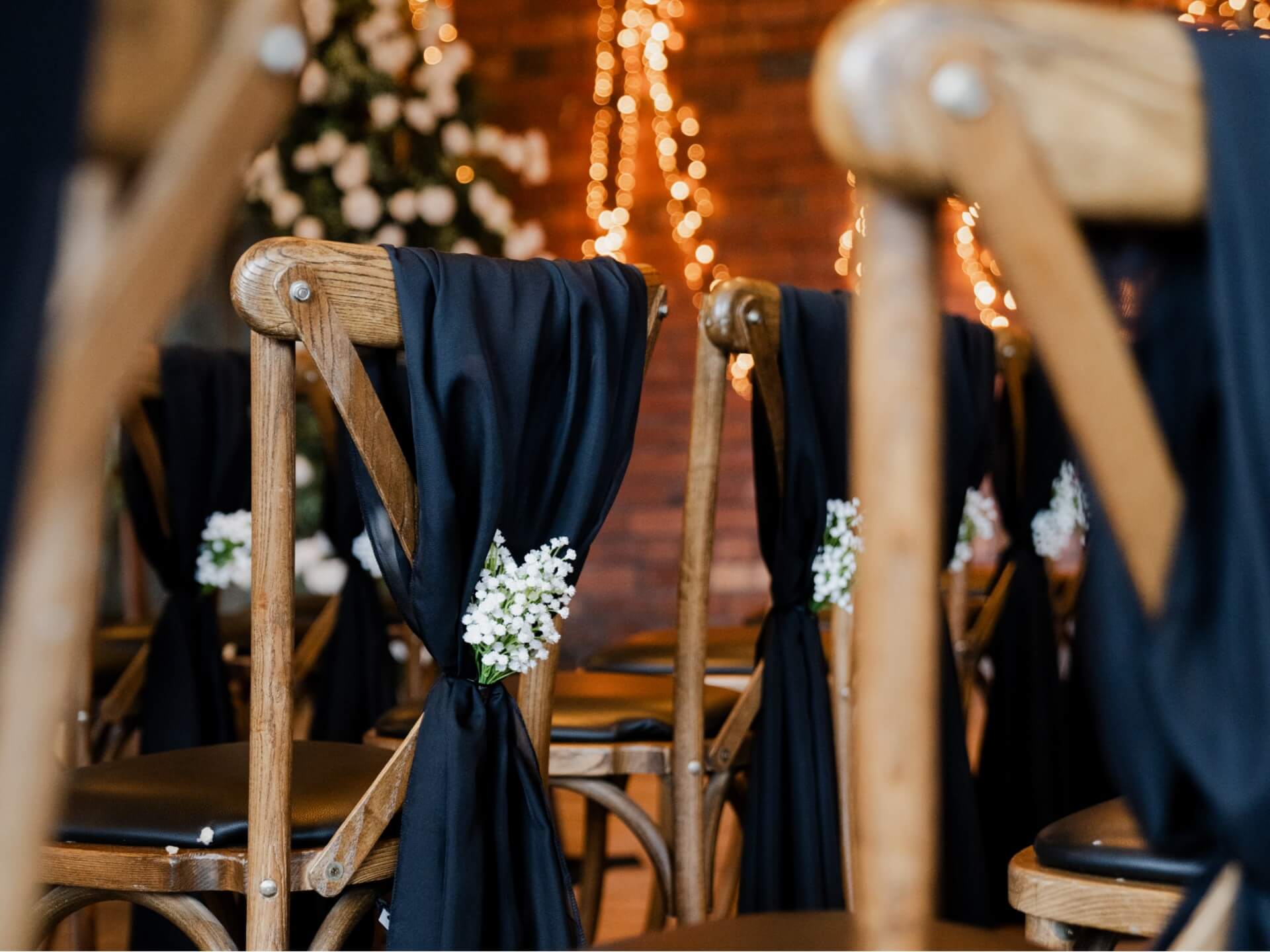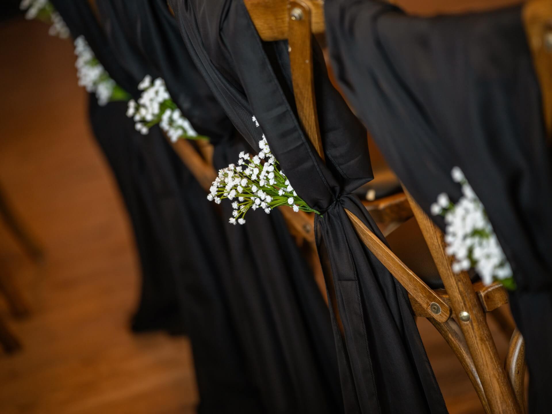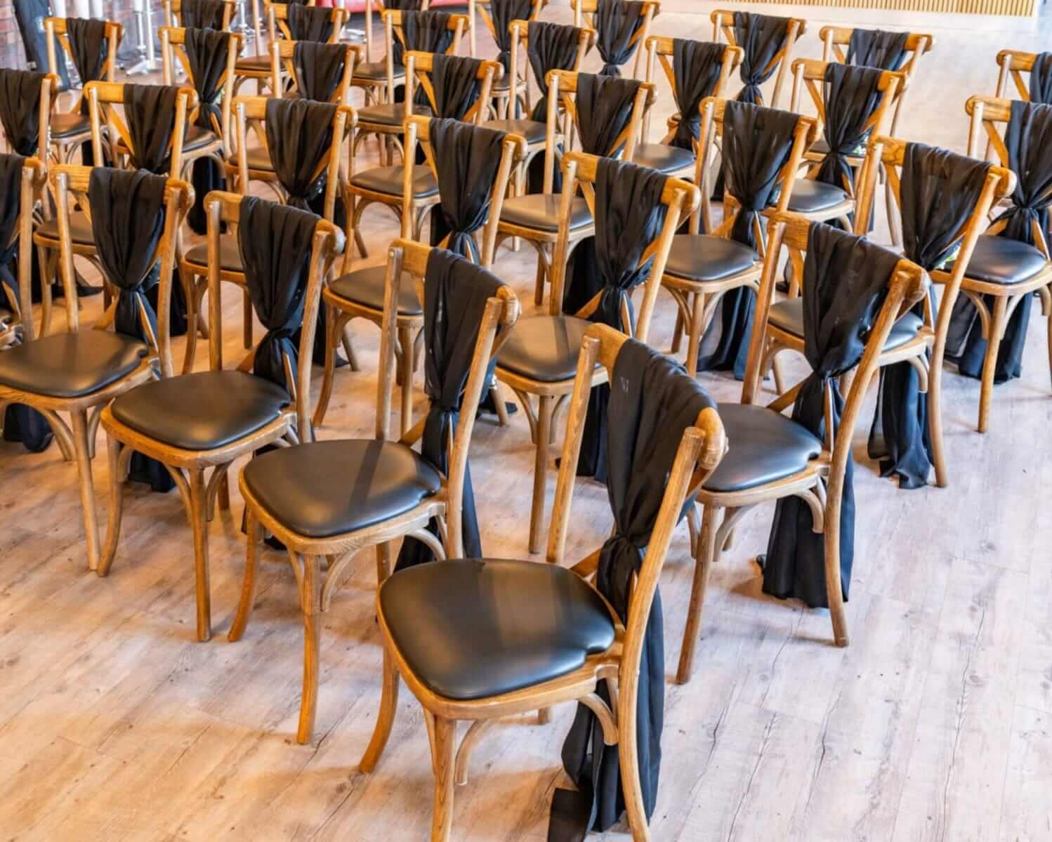 Style black chiffon drape on chiavari chairs, cross-back chairs or standard banqueting chairs for a tidy, venue-ready finish. Let the fabric fall as a clean vertical drop down the chair back, then keep the gather neat so every row looks uniform in photos. For a softer detail, add a small floral cluster or a touch of greenery at the tie point while keeping the drop smooth and even.
