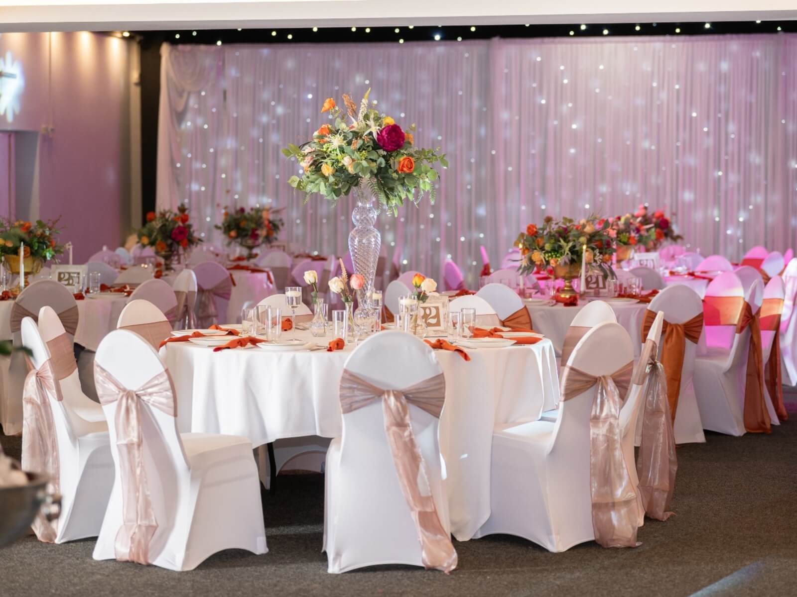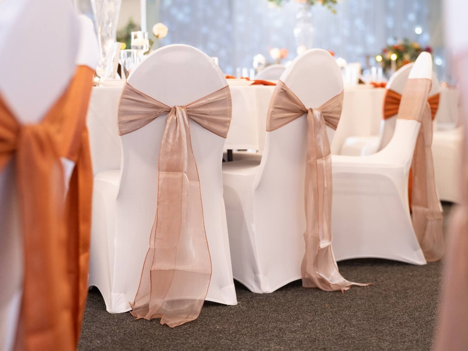 For the best overall finish, we recommend using burlwood silk sashes on banquet chairs with covers, as the shade stands out cleanly against a crisp base and your bows look tidy from every angle. Burlwood silk sashes also work well for aisle seating and top table chairs when you want the same tone repeated throughout the room. If you’re aiming for a balanced palette, these silk sashes pair beautifully with ivory linens, greenery accents and warm metallic details. For a venue-ready look that stays consistent in photos, they’re a reliable option for chair styling across Yorkshire.
