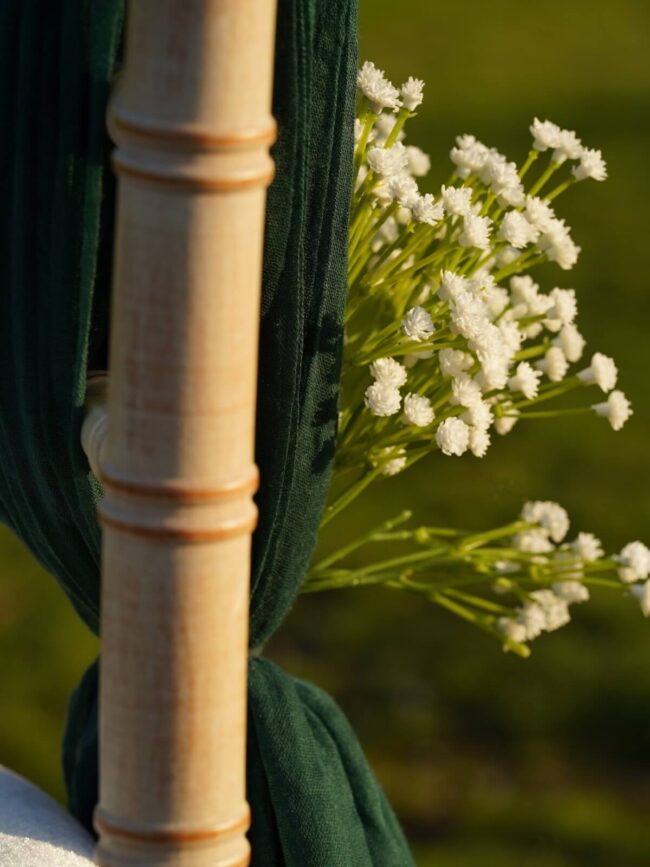 For ceremonies, style green chair drapes as a vertical drop down the chair back for a simple line that photographs beautifully from the aisle and in wide room shots. To keep the room cohesive, repeat the same drop style throughout so green chair drapes look consistent across ceremony rows and reception seating.