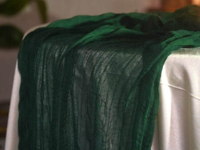 A green cheesecloth table runner pairs well with white, ivory and neutral tablecloths, and it also works with gold details and darker table décor for contrast. It can suit a deep forest green table runner look for moody styling schemes, while still keeping a soft, draped finish through the cheesecloth fabric. For customers comparing tones, this shade can also work as an emerald table runner option, depending on the surrounding flowers, candles and tableware used in the setup.