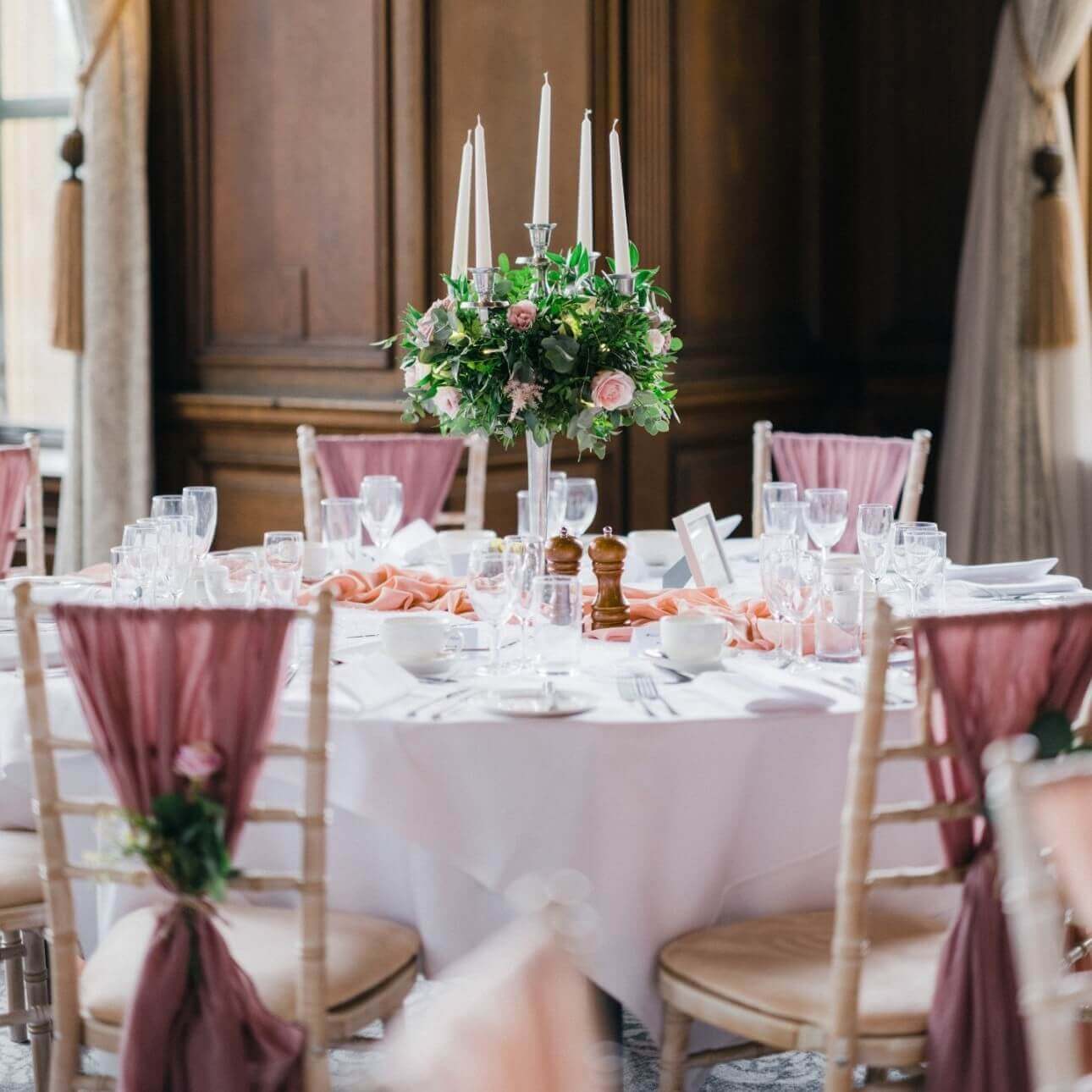 If you’re using chair covers, a mauve drape adds softness and colour while keeping the overall look light. The shade suits blush, ivory, champagne and neutral palettes, and it works well for both wedding breakfasts and evening receptions.