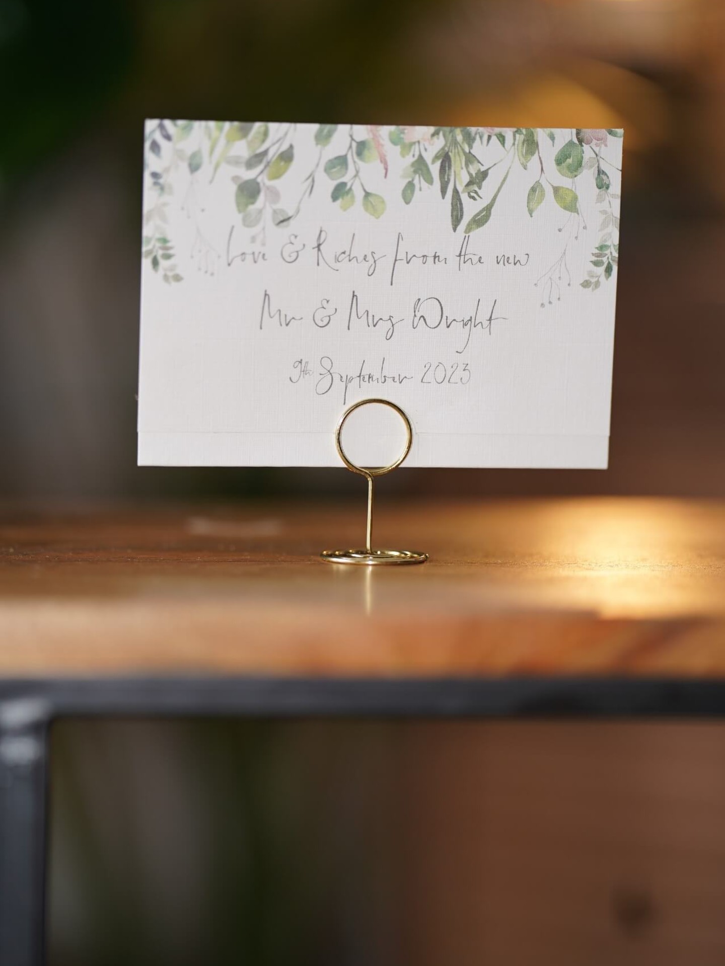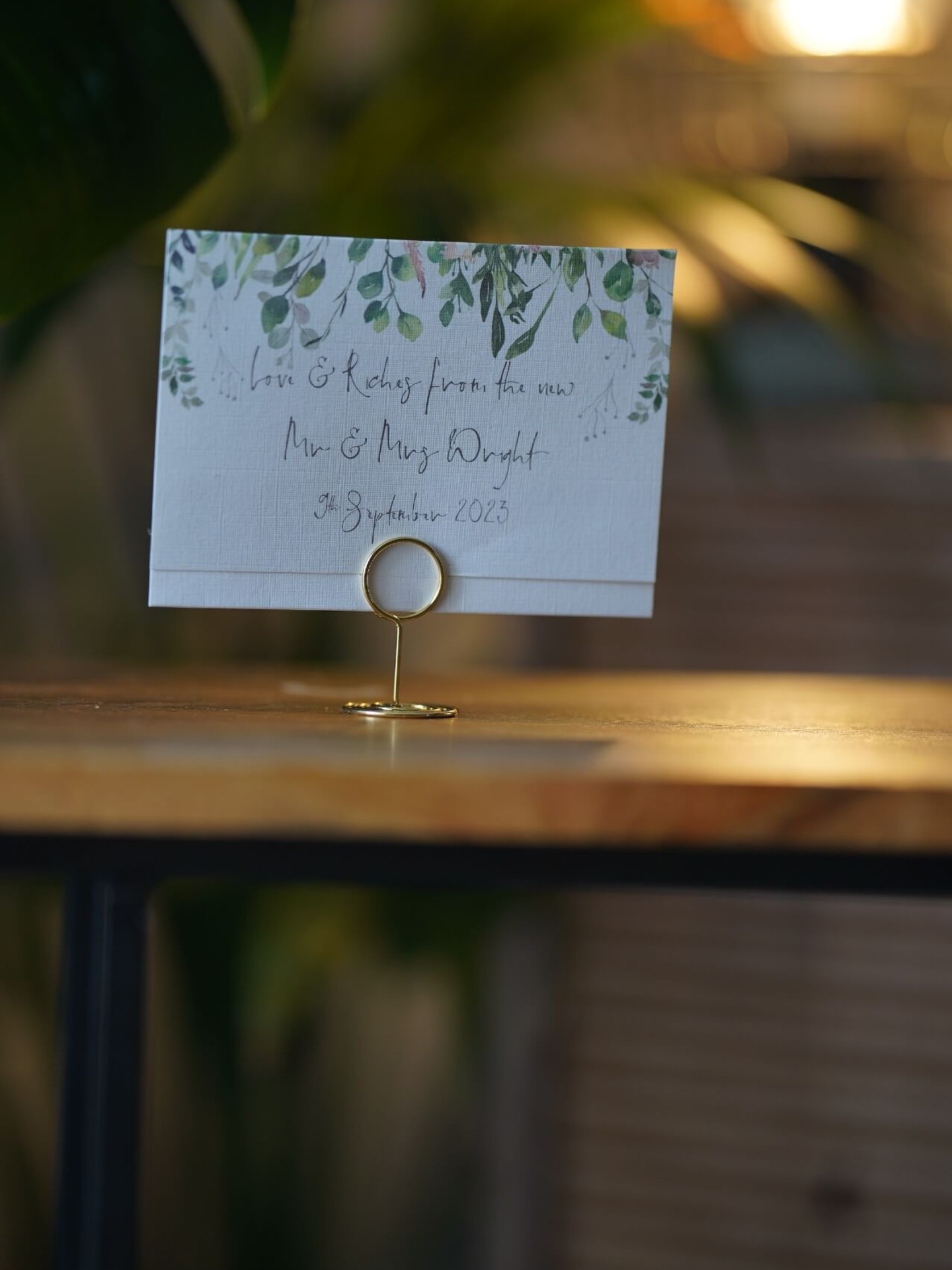 Each holder is crafted from premium materials — including gold, acrylic, rustic wood, and brass — ensuring a seamless match with your chosen theme. From classic black-tie events to bohemian countryside receptions, our name card holders pair beautifully with table numbers, floral centrepieces, and place cards to create a cohesive and elegant table display.