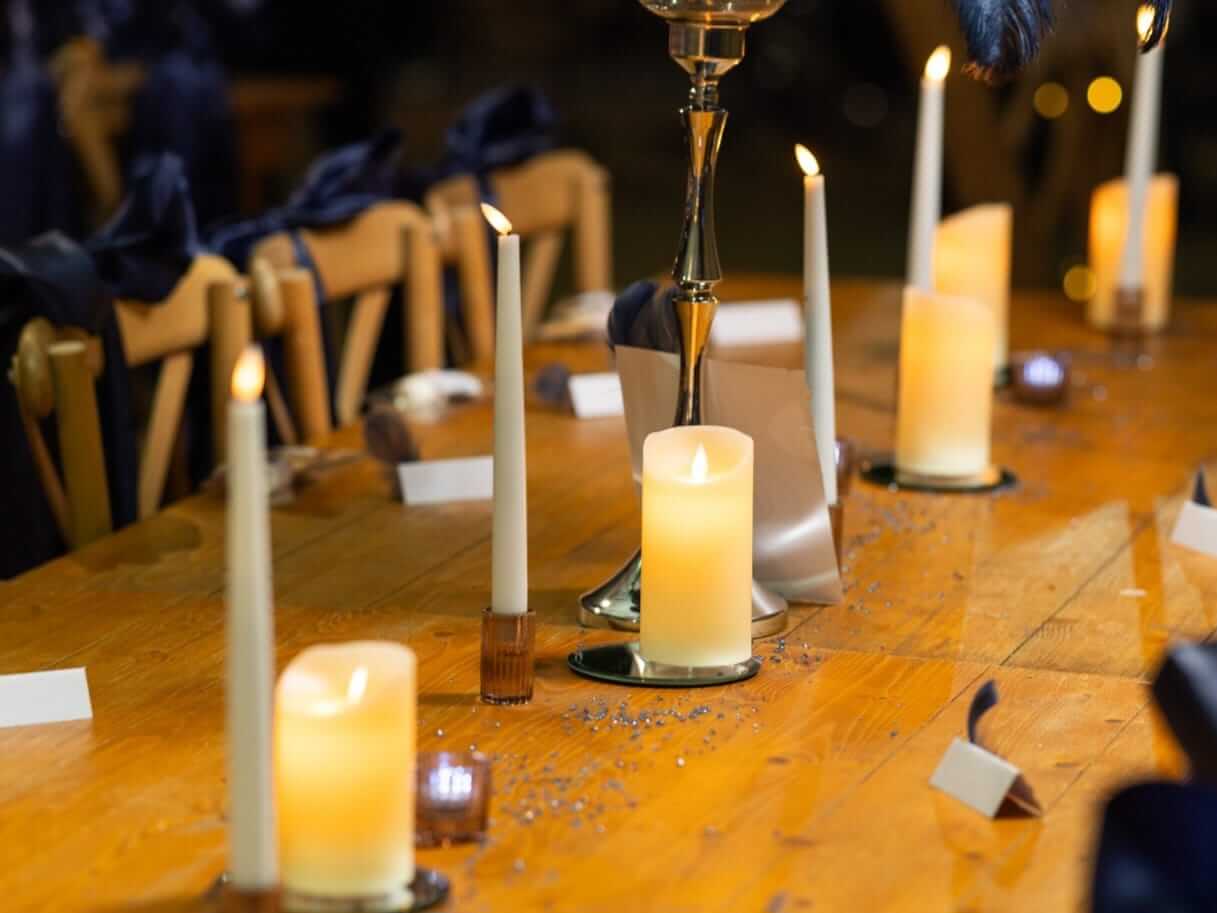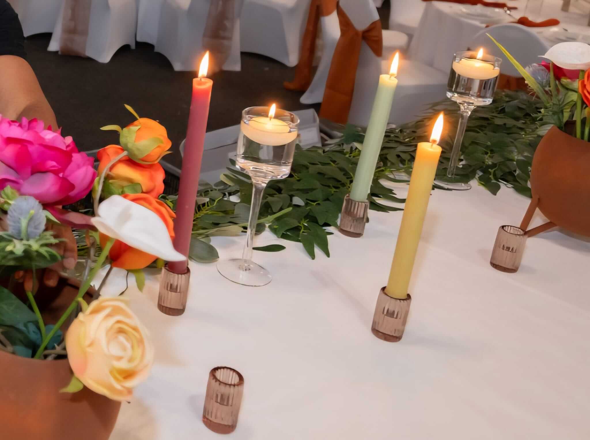 These also work well as small glass candle holders for warm-white dinner candles or LED taper options, depending on your venue rules. They’re especially useful as small candle holders for tapers when you want a slim, elegant candle shape with a subtle tinted-glass glow. If you prefer a consistent look, place one small candle holder at each feature point, then repeat the same candle colour throughout for a tidy, coordinated glow.