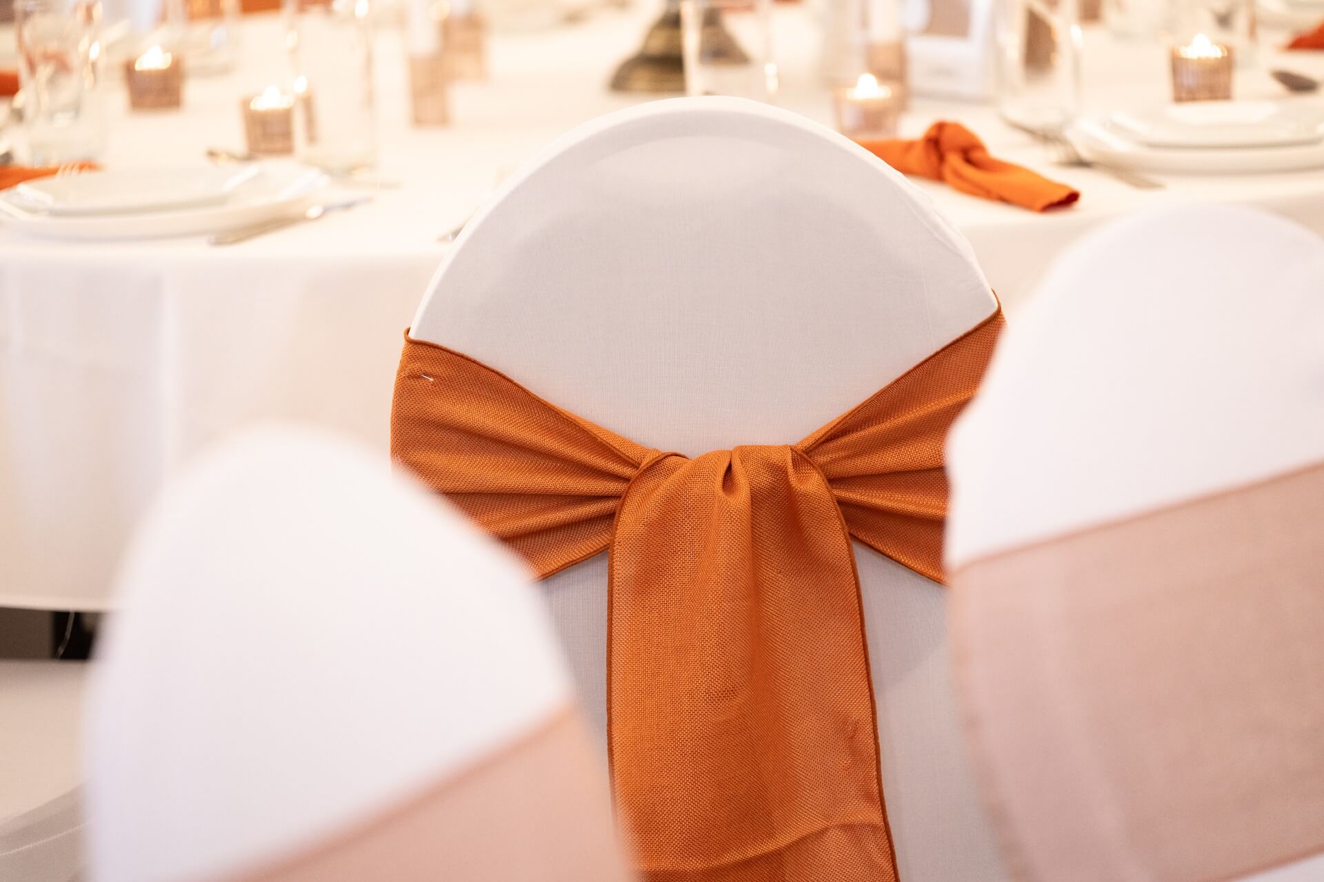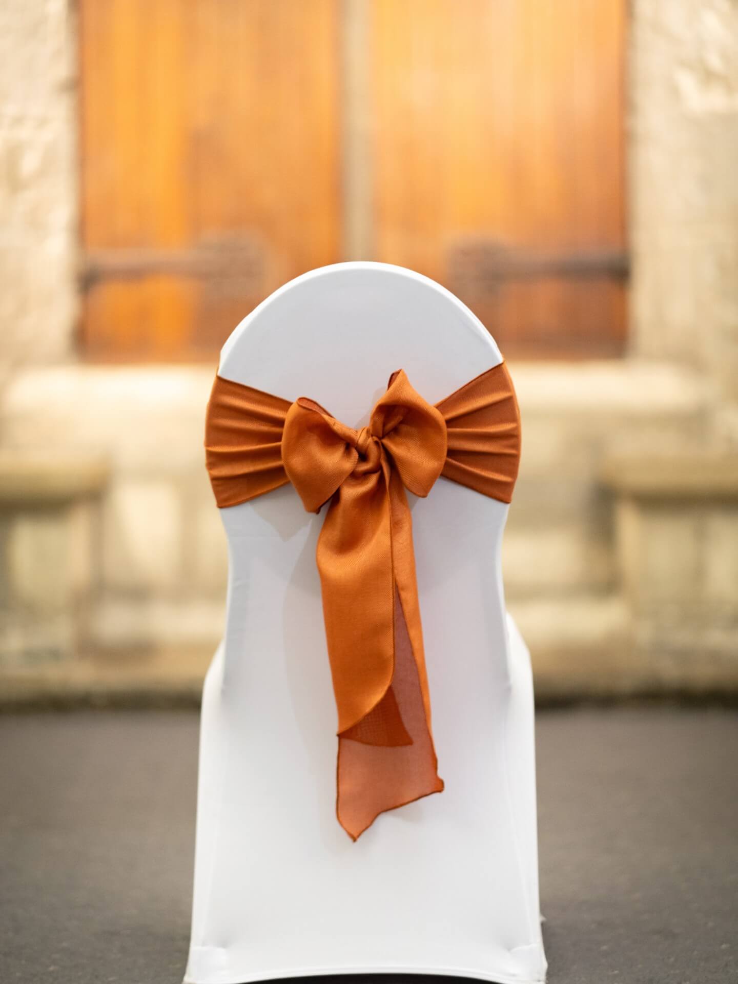 Our terracotta sashes use a burlap/hessian texture that feels structured and holds its shape well. This is why terracotta sashes work so well for tidy bows, knots and simple wraps — ideal when you want your chairs to look consistent from ceremony through to evening reception. The textured finish also adds depth to your colour theme without competing with centrepieces or table décor.