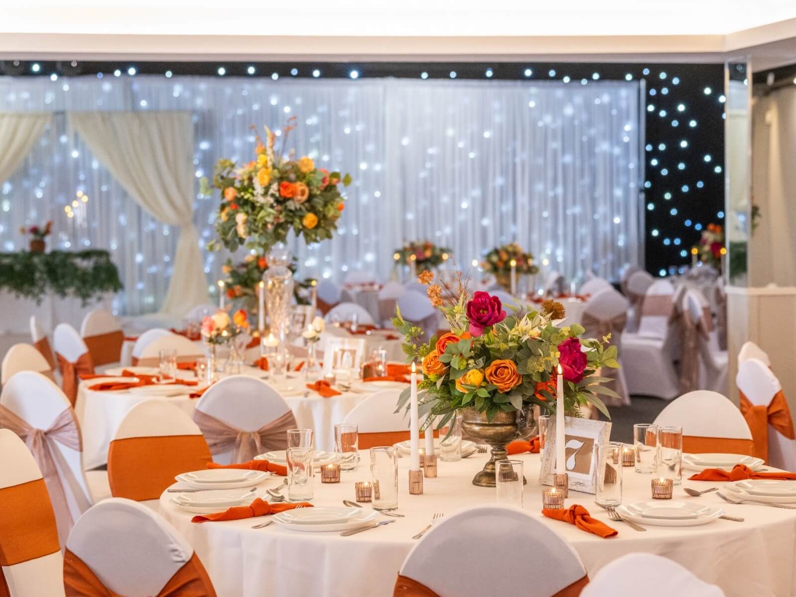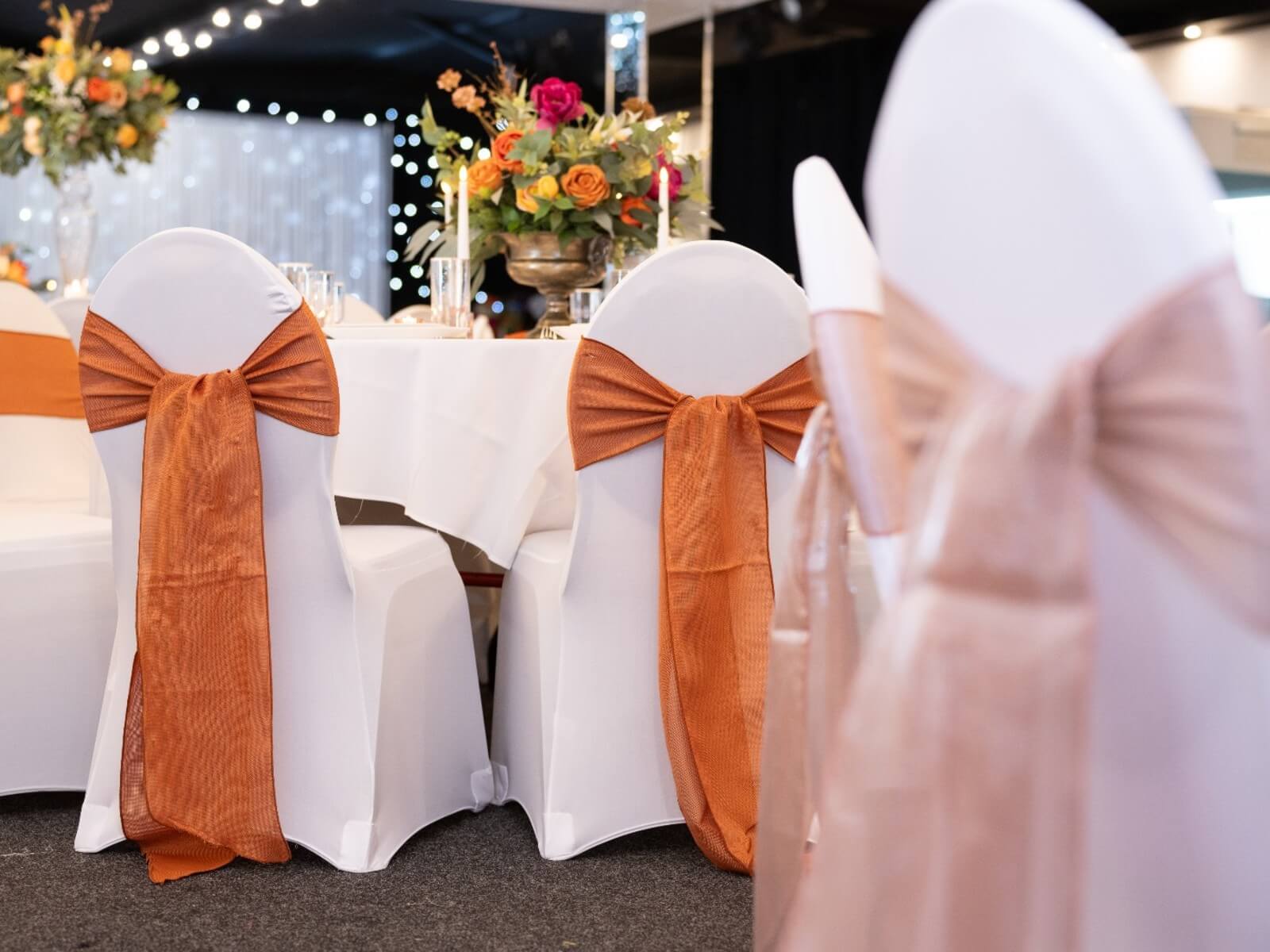 For your real-life setup, terracotta sashes are best used on banquet chairs paired with covers. The contrast between a white cover and the warm terracotta shade looks clean and coordinated in wide venue photos.
