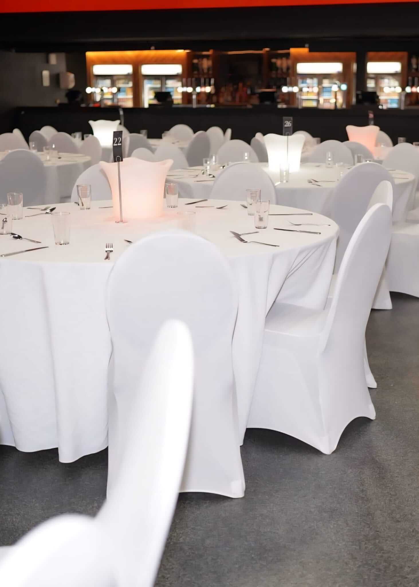 White chair covers are the perfect foundation for a finished look. Add a sash for definition, florals for a softer touch, or drapes on the aisle and feature chairs when you want extra impact. For couples searching specifically for wedding chair covers white, this clean base makes it easy to match your tablescape, florals and signage without the room feeling busy.