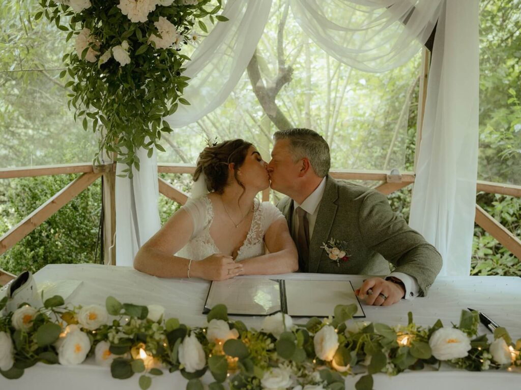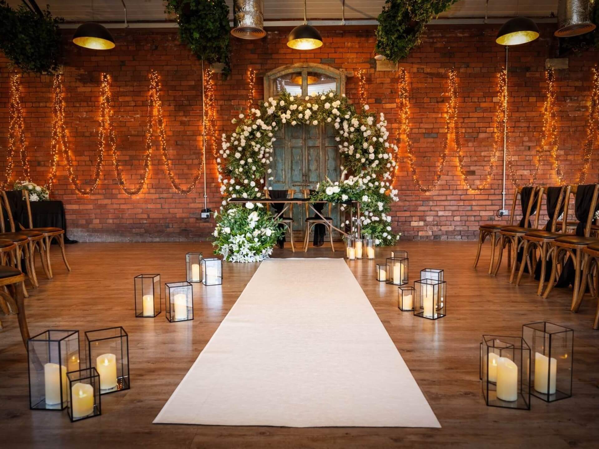 Couples who love floral detail often opt for our Wedding Arch with Flowers (£295) or the Copper Frame Backdrop with greenery and drapes (£240). For traditional ceremonies, our Chuppah Ceremony Backdrop begins at £200, offering an intimate canopy effect.