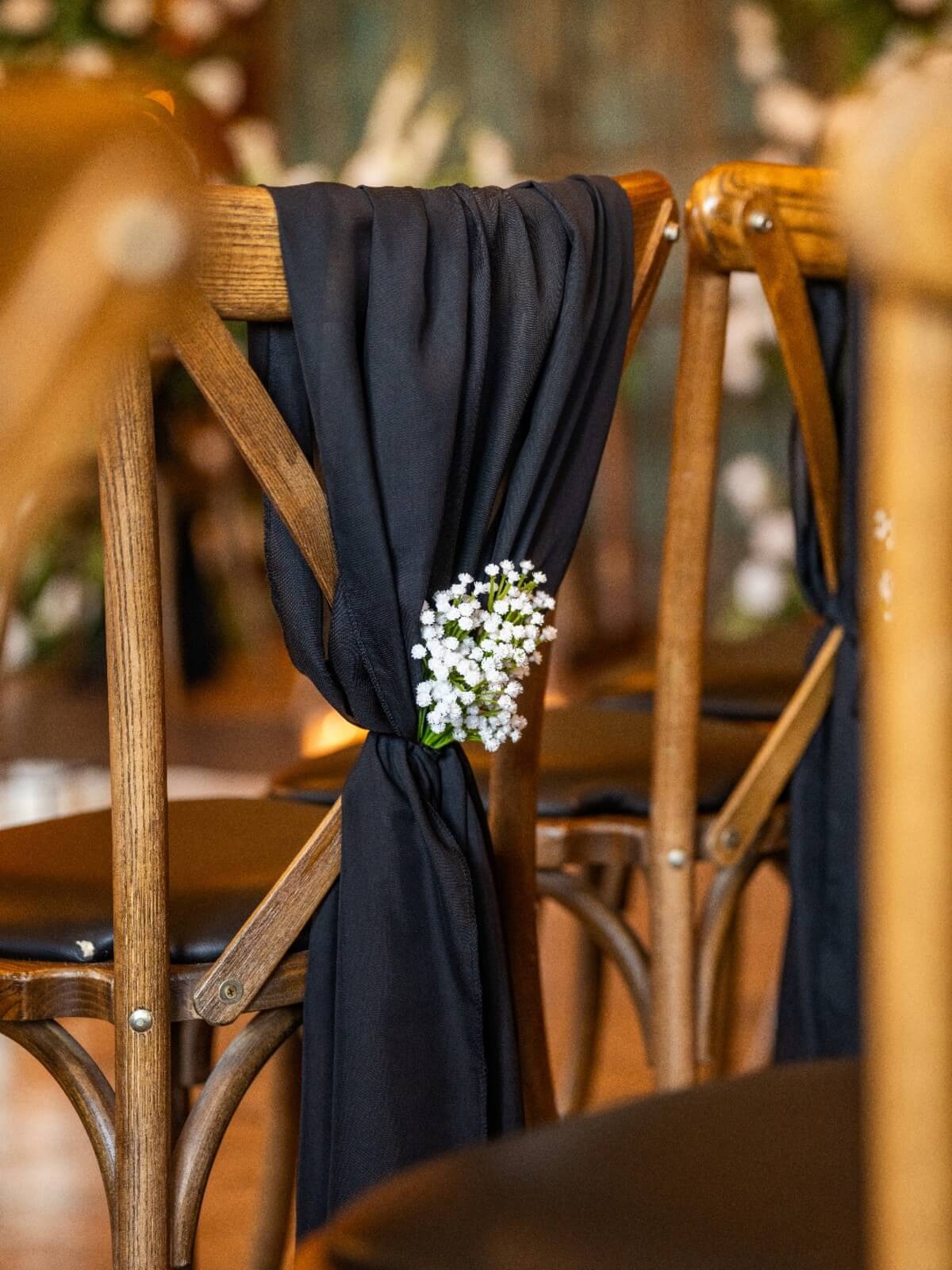 Inside the ceremony space, we created a seamless transition between modern and organic elements. Rows of cross-back wooden chairs were dressed in flowing black chiffon drapes, adding depth and contrast against the warm wood tones. Each chair was finished with a small bundle of baby’s breath flowers, tied neatly at the back — a simple touch that softened the monochrome look with a whisper of romance.