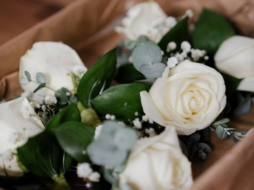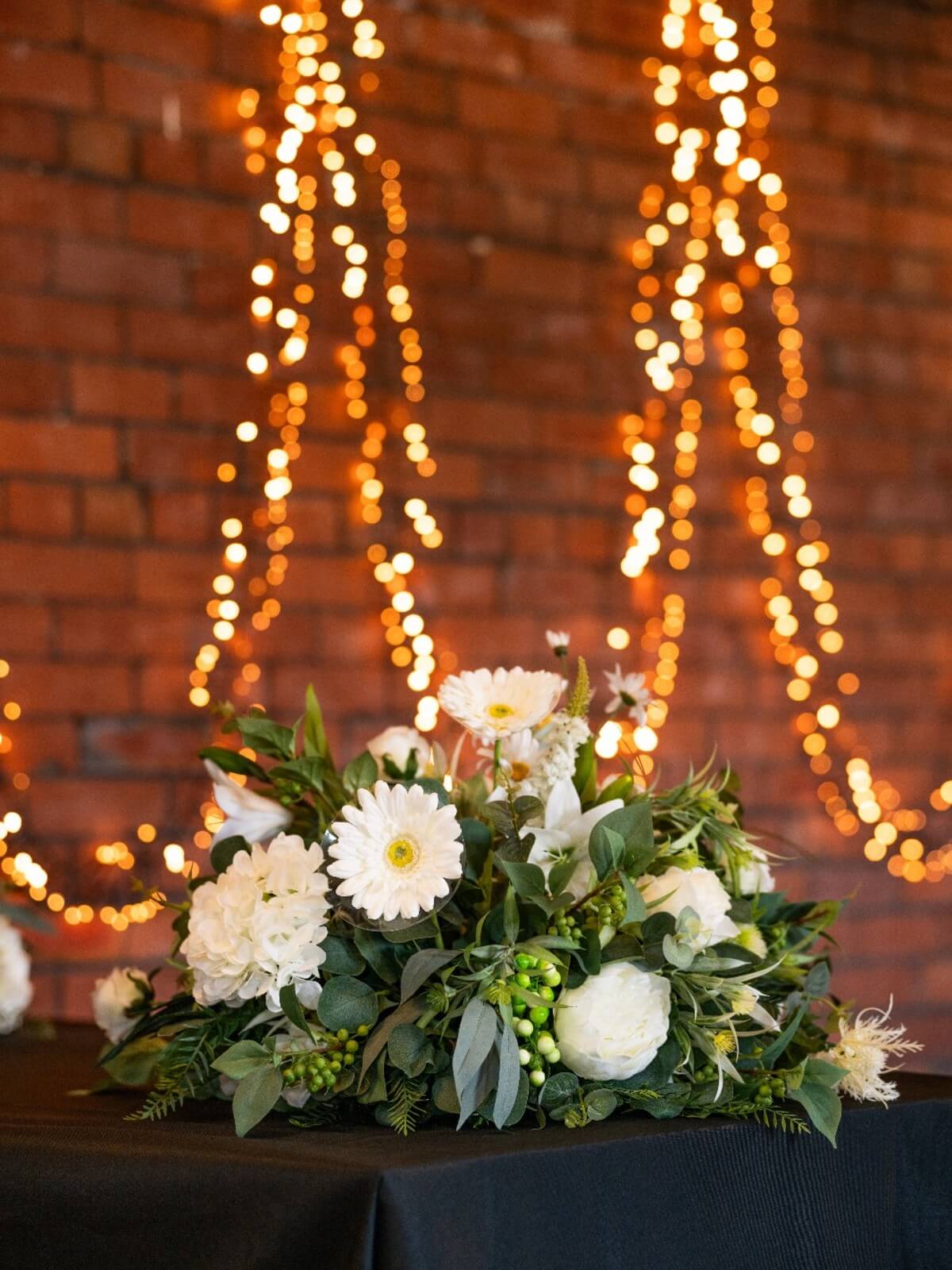 A striking artificial flower arch marked the entrance to the venue — a luxurious statement piece featuring crisp white roses, delicate petals, and lush green foliage. Positioned beneath the venue’s tall ceilings, it provided a stunning contrast against the exposed brick walls, setting the tone for the celebration ahead. Guests couldn’t resist stopping for photographs as they entered, making it both a design feature and a memory-maker.
